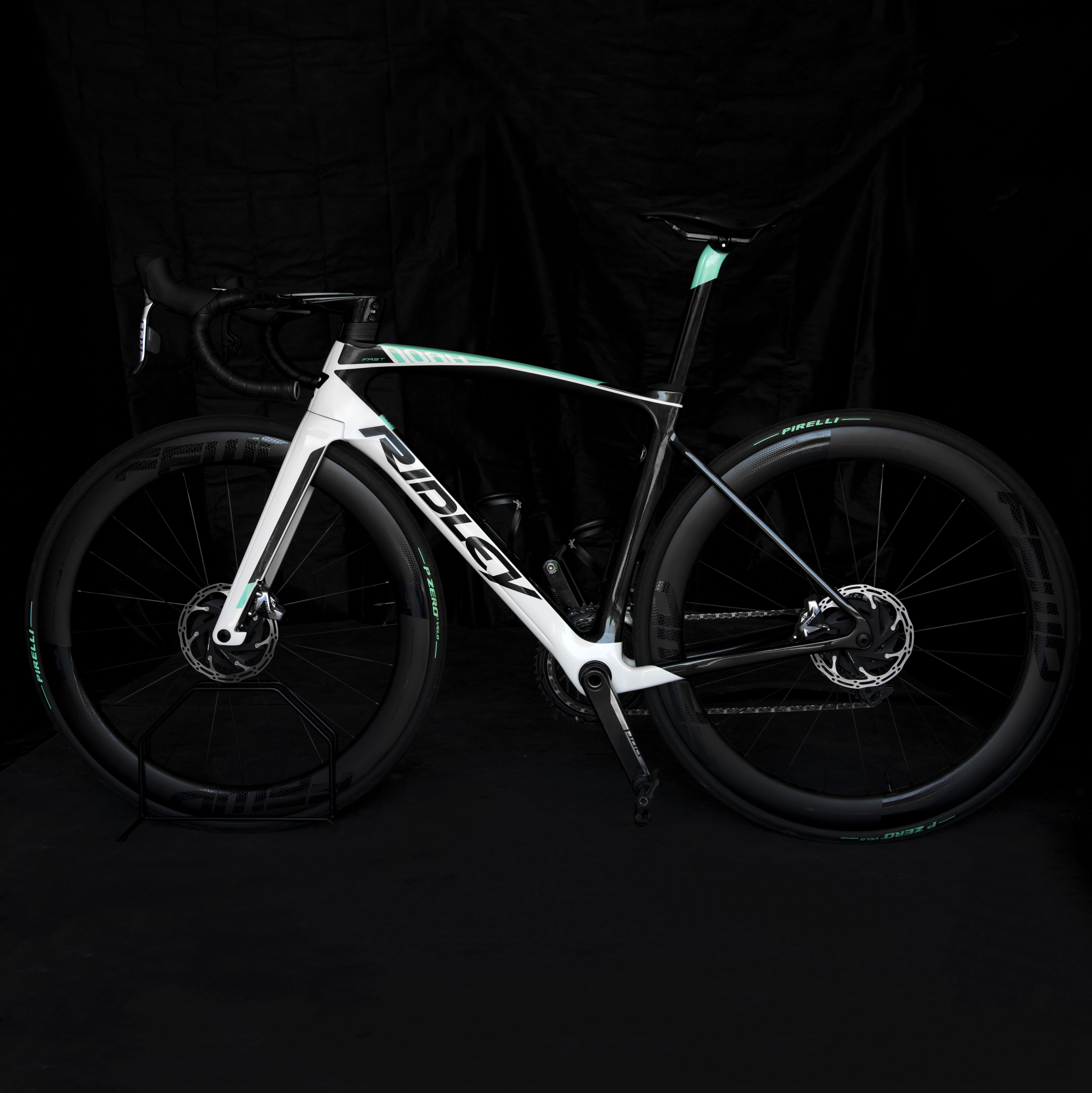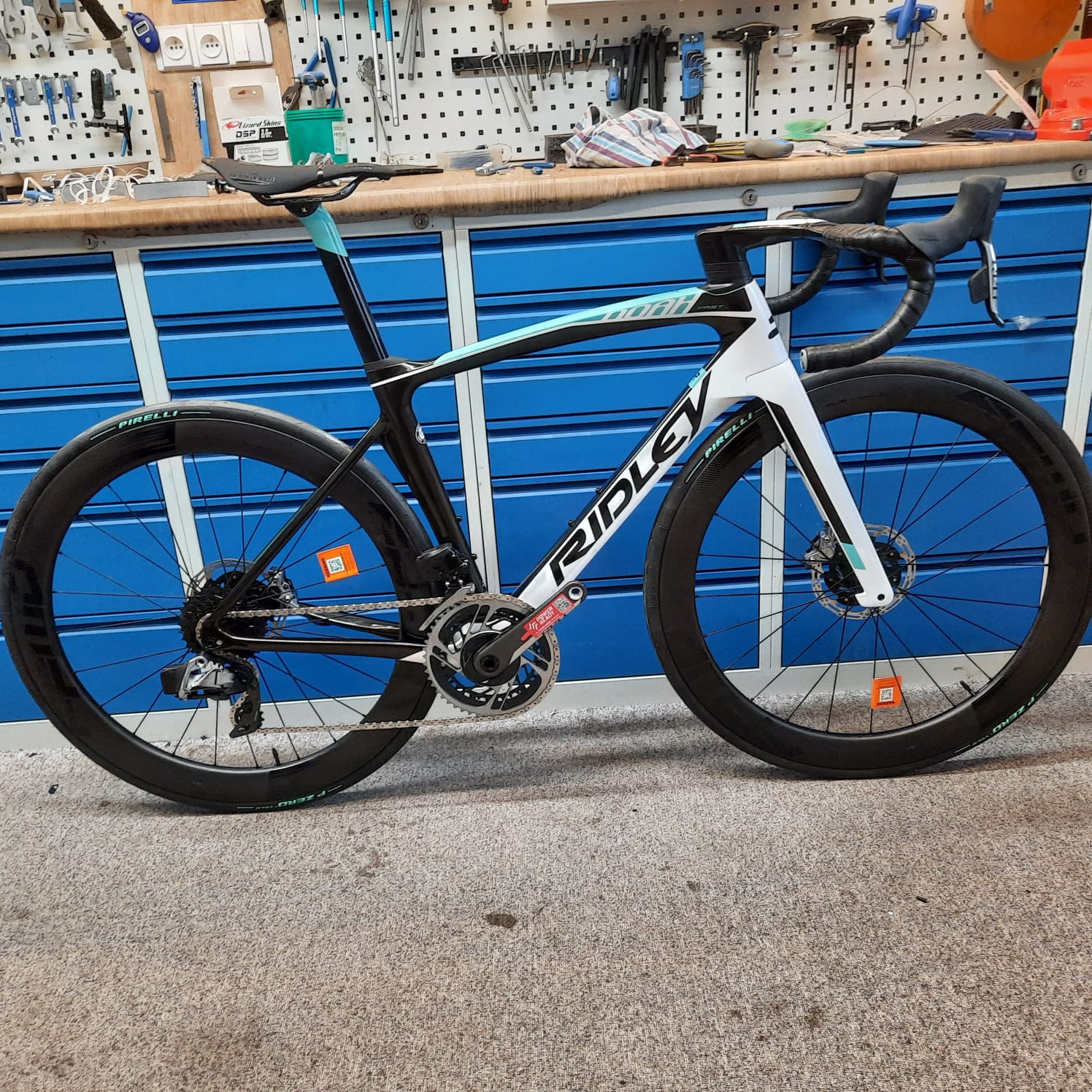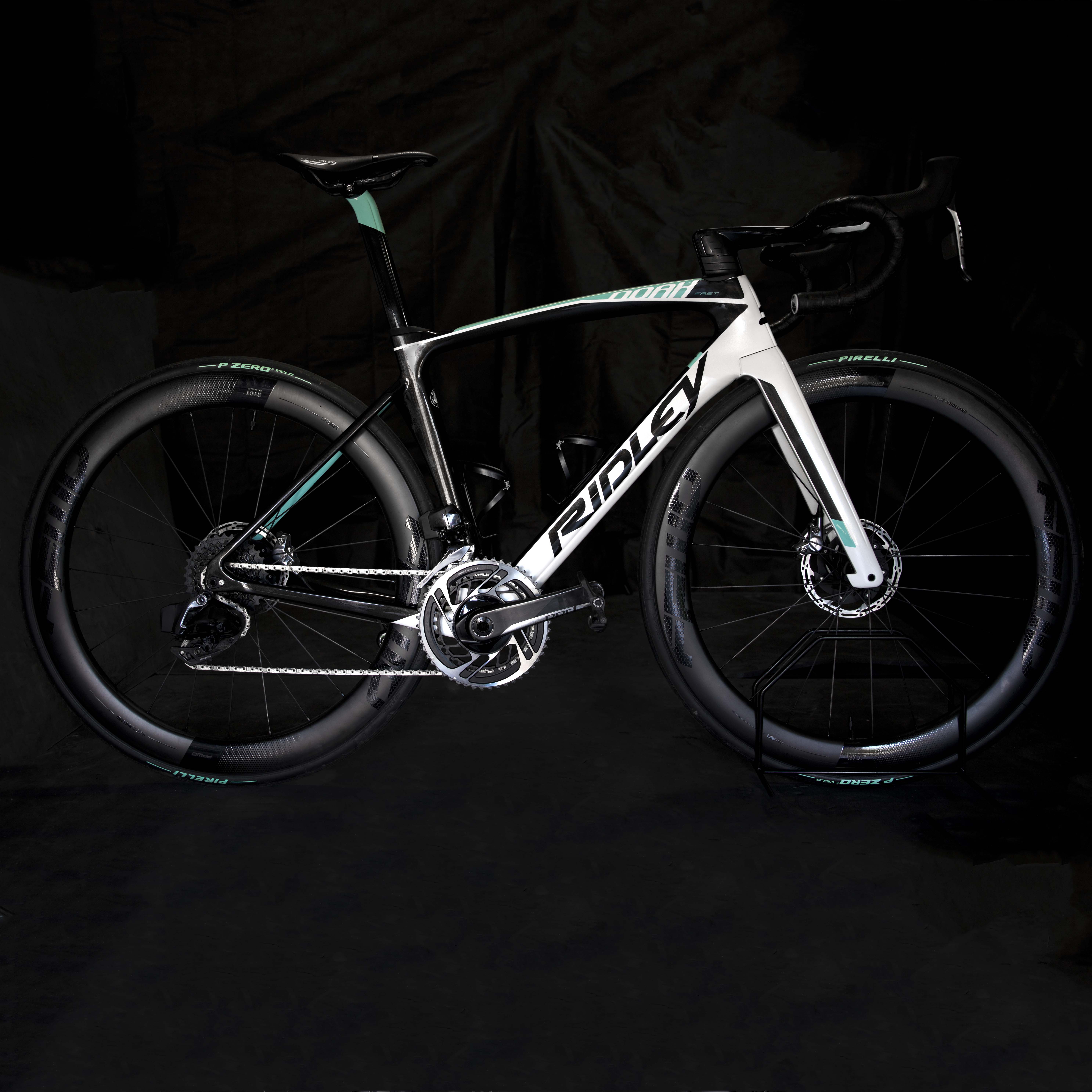 Kolo disponuje rámem vlastního designu, navrhnutým v Ridley konfigurátoru. O osazení kola se stará plně bezdrátová sada SRAM Red AXS nejnovější generace, kolo se pyšní také hydraulickými brzdami. Kolo je osazeno Ridley kokpitem v délce 120mm a šíři 440mm, omotávka nemohla být zvolená jinak, než Lizard Skin DSP 3,2mm pro maximální možný komfort. Zapletená kola pro východočeskou placku zněla volba na nové Fast Forward FFWD Riot 55 s náboji DTSwiss, které stejně jako Ridley pochází z Beneluxu. Pláště v limitované edici Pirelli P Zero Celaste 25C k soudržnosti celého designu kola. Sedlo mělo být dle požadavků krátké a jelikož rádi stavíme na San Marcu, sáhli jsme po verzi Shorfit Carbon FX Wide. Kolu nechybí ani wattmetr zabudovaný v pedálech od Favera, konkrétně model Assioma.