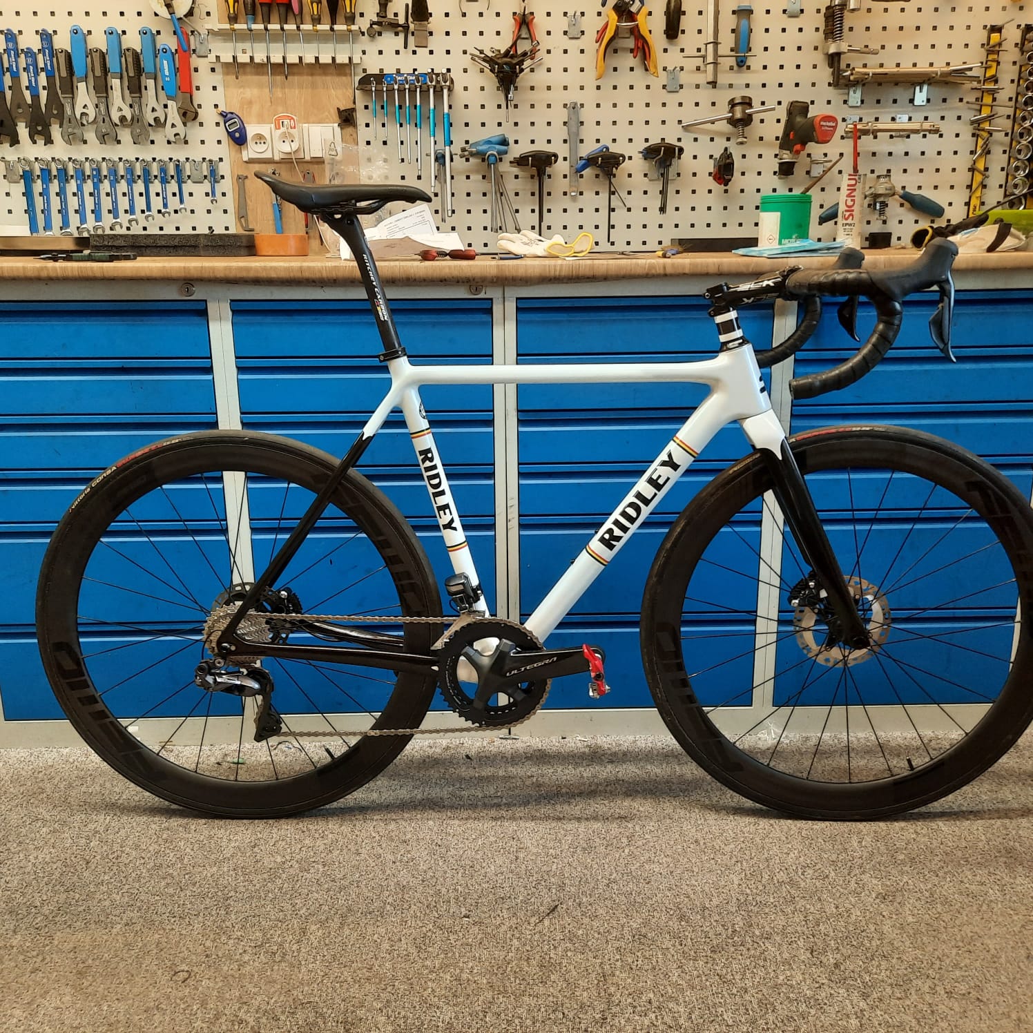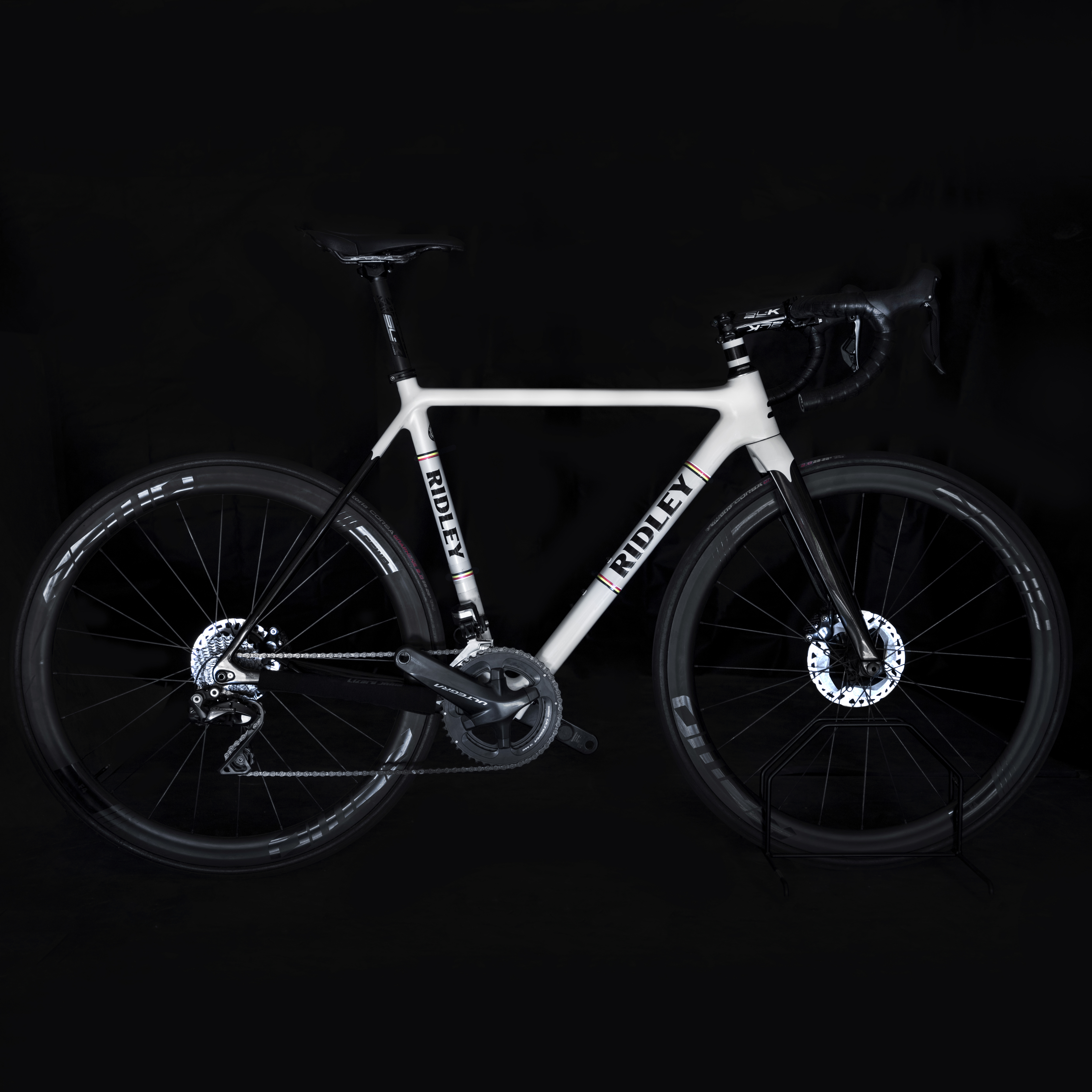 Kolo disponuje rámem vlastního designu, tím je model nesoucí název Heritage navrhnutý v Ridley konfigurátoru. O řazení se zde stará lety prověřená elektrická verze Ultegry R8070. Dále bylo kolo osazeno klikami Ultegra CX 170mm 46/36 se zabudovaným měřením výkonu v levé klice, či případně alternativou R8000 170mm 50/34. Doplňky jako sedlovka a představec jsou pak od výrobce FSA a to konkrétně modelová řada SL-K v karbonu. Pro ideální opěrný bod při akceleraci bylo pak zvoleno Sedlo San Marco GND Carbon, se zadní zvýšenou stavbou. Omotávka Lizard Skin DSP 2,5mm nám pak zajistí kýžené pohodlí a vyhovující úchop pro naše ruce. Silniční set zapletených kol jsme pořídili jedny z posledních Fast Forward FFWD F4D matt-black za výprodejovou cenu od dealera, osazeno galusky Vittoria Corsa G2.0 v rozměru 25C. O Gravel výplet jsem se postarali my, Nextie ráfky Premium s výškou 45mm a šířkou na 27mm, náboje ZTTO ratchey systémem 60Z, přímé dráty a niple SAPIN CX RAY, obuto do Challenge Baby Limus 33C bezduše s vložkami do ráfku TUBOLIGHT CX.