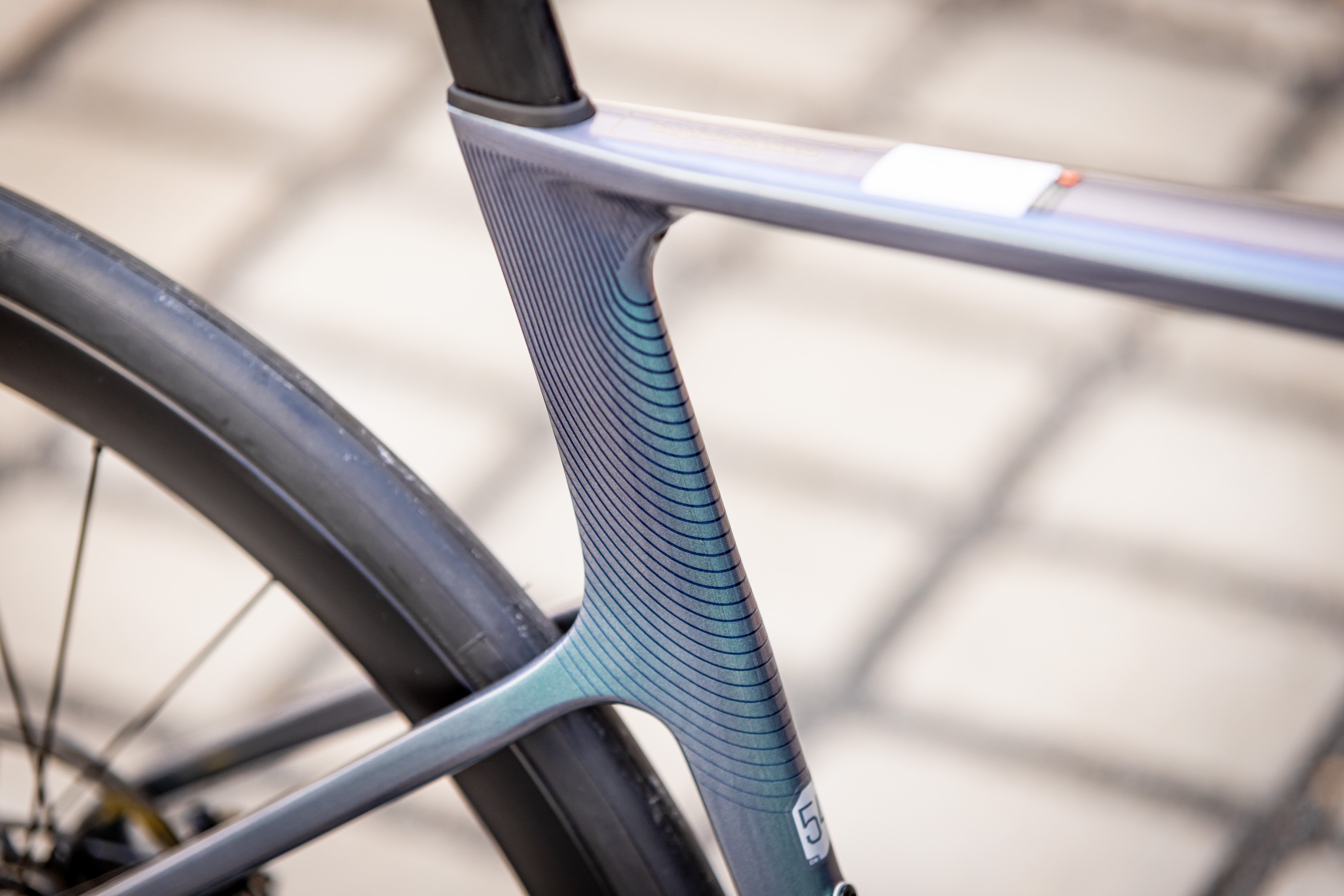 Kolo, které kombinuje špičkový výkon a jedinečný design. Rám je vyroben ze špičkového karbonu, což zajišťuje extrémní tuhost a nízkou hmotnost, ideální pro závodní výkony. Geometrie rámu je navržena pro agresivní posed a maximální kontrolu na silnici. Chameleonová barva rámu se mění podle úhlu světla z fialové do zelené, což tomuto modelu dodává zcela unikátní vzhled.