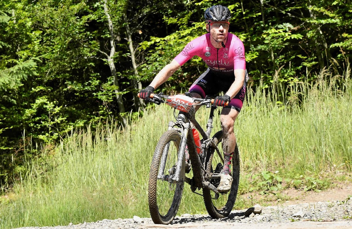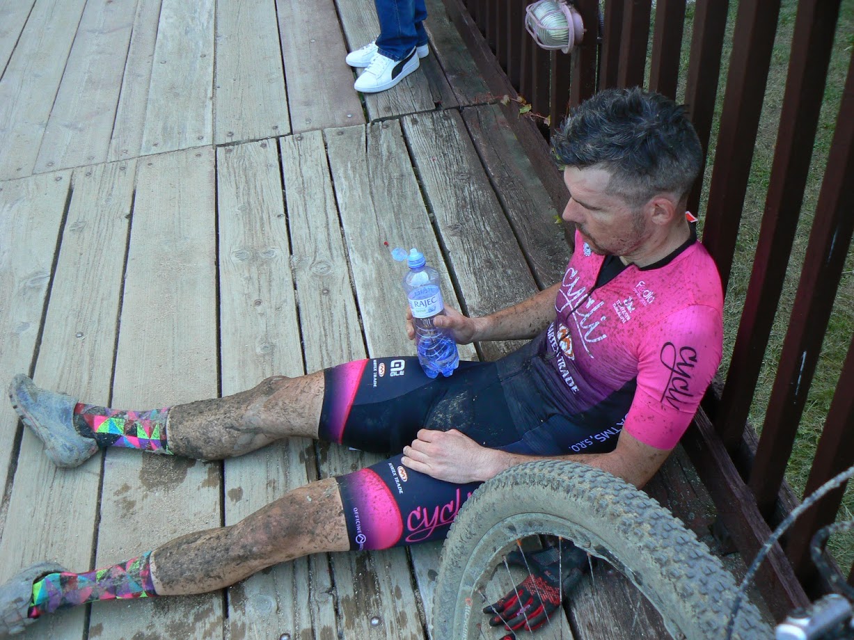 Tady ale začíná to pravé peklo - asi 20 km do Semetína, které jsou nejtěžší na trase. Bláto, nahoru dolů, zakončené sjezdem po trailu v Bike Aréně Vsetín, který si vůbec neužívám a před kterým dělám chybu a nechávám si odjet skupinu včetně Martina. V Semetíně jsem rád, že se můžu zastavit u občerstvovačky a nacpat se normálním jídlem. Táhlý výjezd na Chléviska je relativně snadný a držím si po pozice. Po výjezdu na Lukov přichází ta správná krize. Chvílemi nevím, kde vlastně jsem a jedu už jen na dokončení. Naštěstí zbývá poslední, zhruba dvacetiminutový kopec na Ondřejovsko, na který už se “nějak” vyškrábu. Hrubou Malíkovou už tradičně tlačím, nenacházím v sobě dostat Kousek před cílem už jedu s jedním závodníkem, shodujeme se, že jsme si to pěkně odtrpěli a že nebudeme zbytečně spurtovat, protože jsme v rozdílných kategoriích. Cílem projíždíme na desetinu vteřiny přesně spolu, časomíra mu ale dává pozici přede mnou.