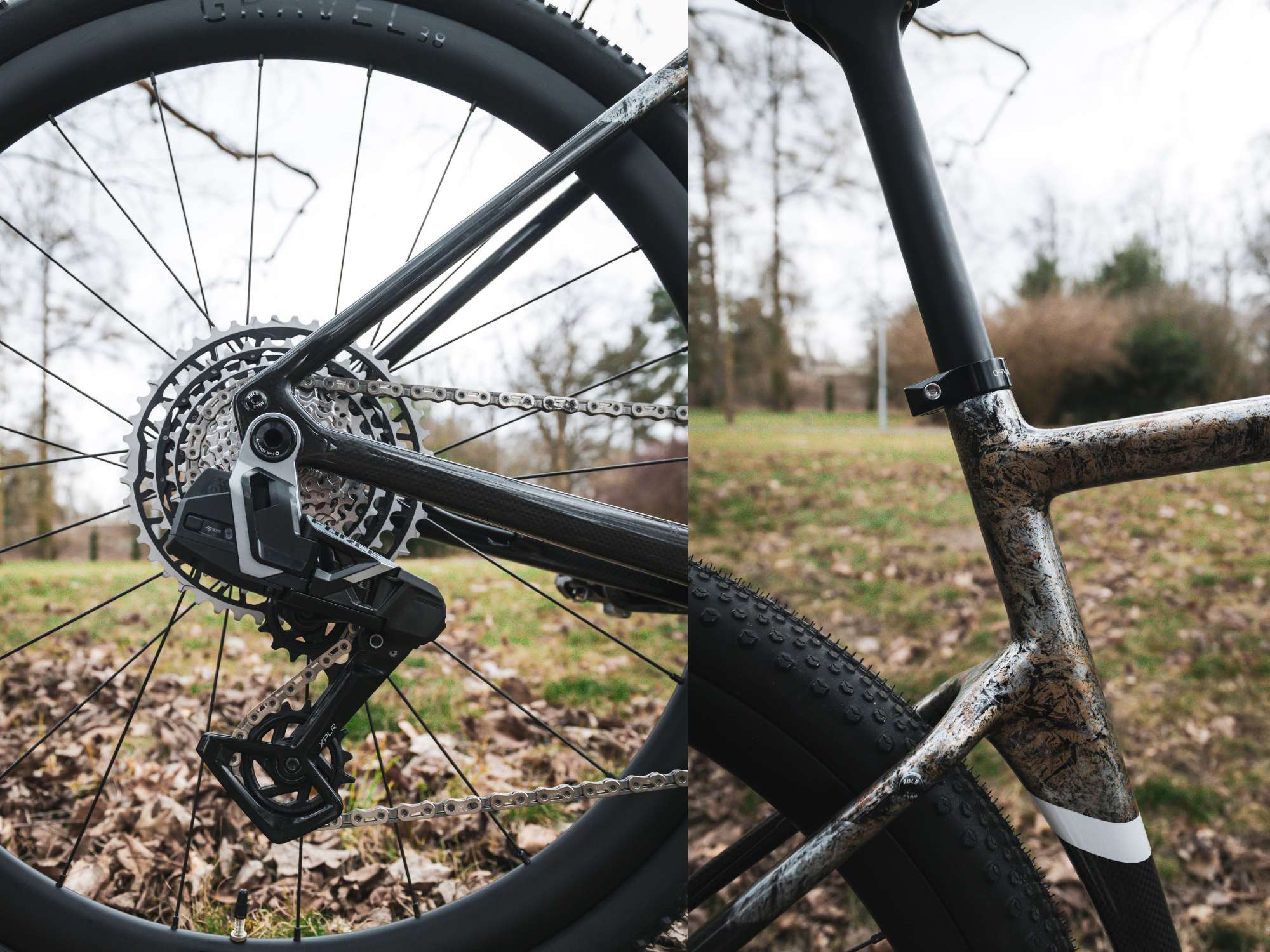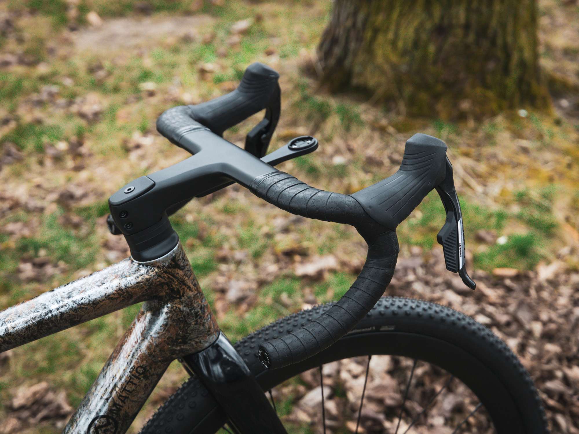 Konkrétní testovací kus je postavený ve velikosti 54 a je osazený karbonovým kombem. K tomu karbonová gravel kola přímo od Officine Mattio a pohon SRAM Force XPLR AXS v konfiguraci 1x13. Jednoduché, lehké a funkční řešení.